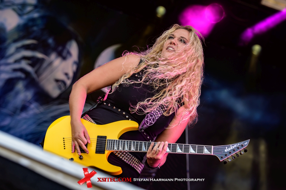 Auf der DARK-Stage wir es danach noch etwas heißer, denn hier haben sich die BURNING WITCHES angesagt, die mit klassischem Heavy Metal den Fans einheizen. Das aktuelle Album „The Dark Tower“ kommt dabei ebenso gut an, wie die arrivierten Titel der Hexen. Nur gut, dass die Grabenschlampen auch an diesem Tag per Feuerwehrschlauch für Erfrischung des Publikums sorgen. Danach gibt es „Tales From The North“ mit BLOODBOUND, deren neues Album am heutigen Tag Premiere hat. Die Schweden zelebrieren einen denkwürdigen Gig, der für mächtig Stimmung sorgt. SEPTICFLESH direkt danach hatten auf ihrem Flug Probleme mit ihrem Gepäck, weswegen die Band mit geborgten Instrumenten und ohne ihre Maskerade auf die ROCKHARZ-Bühne muss. Dass dies in Anbetracht der immer noch mörderischen Temperaturen für die Symphonic-Death-Metaller auch Vorteile bringt, lässt sich nicht von der Hand weisen, der Stimmung ist das ungewohnte Outfit der Band nicht abträglich und so gibt es nach dem Rausschmeißer „Dark Art“ einen Orkan an Ovationen.