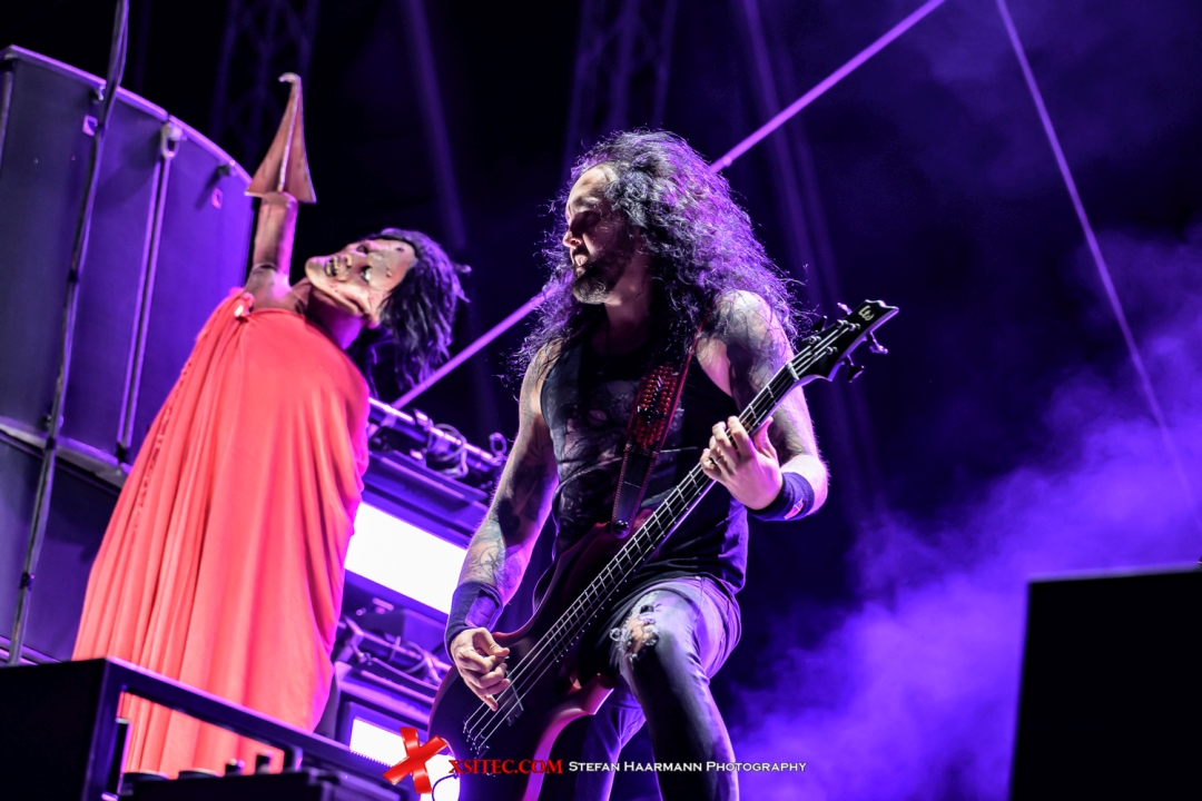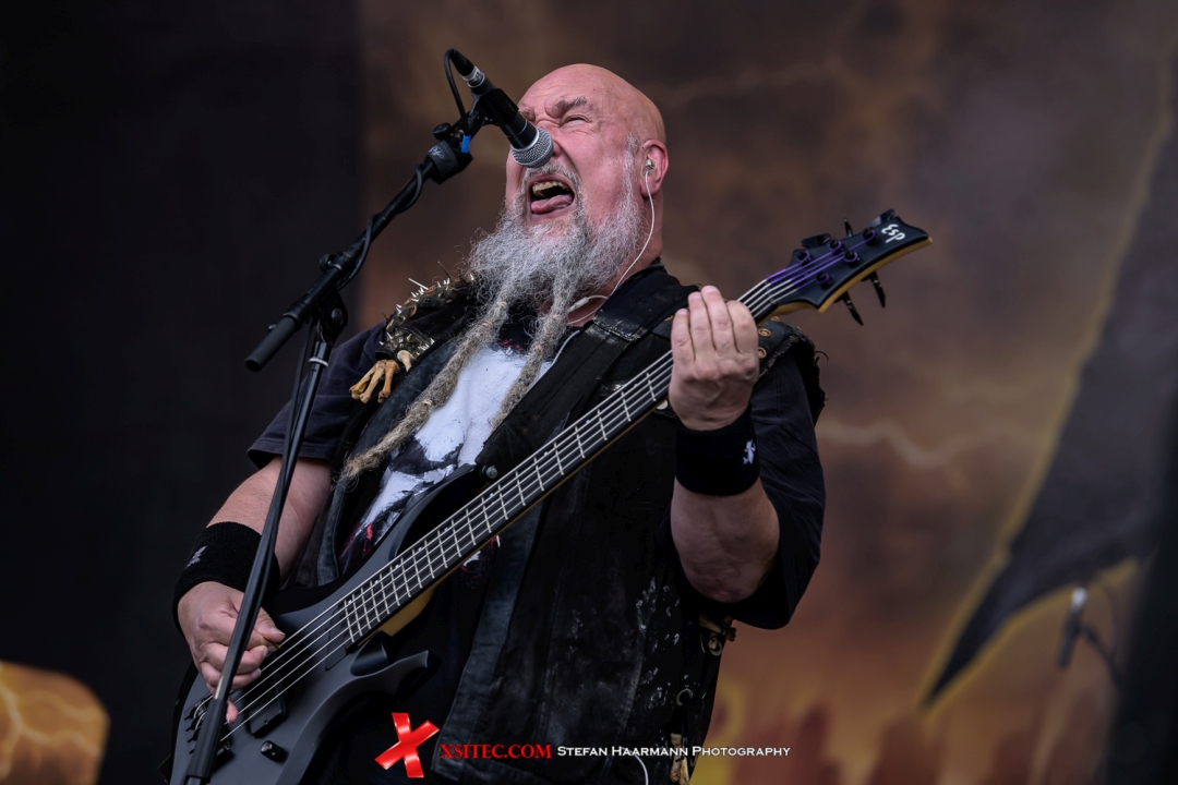 Weiter geht es im Anschluss mit KREATOR, die seit je her einen Proberaum in der Zeche Carl in Essen halten und von dort aus ihren weltweiten Triumphzug angetreten haben. Mille Petrozza und seine Bande starten mit „Hate über alles“ zu Feuersalven aus den Pyroaggregaten, die die sonst nicht sonderlich helle Szenerie in zuckenden Blitzen erleuchten. „Hordes of Chaos (A Necrologue for the Elite)“, „Satan Is Real“ oder „Terrible Certainty“ sorgen für zahlreiche Moshpits, während die Grabenschlampen erneut die Flut der anlandenden Crowdsurfer bewältigen müssen. Als Rausschmeißer gibt es „Pleasure To Kill“, das nochmals alle Kraftreserven der Fans vor der Bühne mobilisiert.