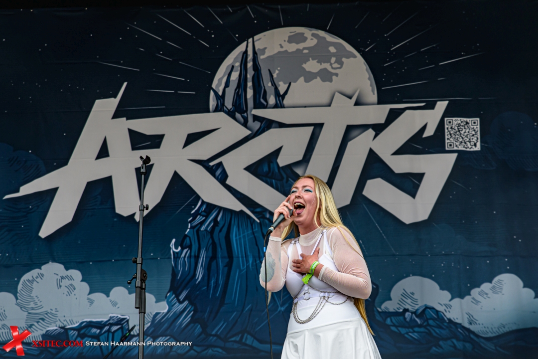 Nebenan betreten anschließend ARCTIS stilsicher die Bühne: Die Herren in Schwarz, Frontfrau Alva Sandström strahlend in Weiß – visuell ein Hingucker. Musikalisch bewegen sich ARCTIS zwischen Symphonic Metal und verspieltem Gothic-Einschlag. Das Publikum ist angetan und zu früher Stunde bereits hellwach und feierwütig.
