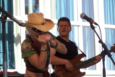 Diesmal wurden seine BLUENATICS durch KELLIE RUCKER, die kleine große Harp-Spielerin aus Kalifornien, ergänzt und diese [sorry Richie, Du wirst es verschmerzen ;-))] zog natürlich alle Blicke und Ohren auf sich. Selbstverständlich achtete der Schreiber dieser Zeilen weder auf den entzückenden Bauchnabel noch ihren beneideswerten Lederhut. Allein das Harp-playing der Dame war schlichtweg sensationell. Wie sie ihre „Hoochie Coochie“ traktierte hätte einem LITTLE WALTER zu aller Ehre gereicht. Leider kamen die ganzen Feinheiten ihres Spiels soundbedingt nicht optimal zur Geltung. Die Zuschauer, die entweder in den vorderen Reihen saßen oder -noch besser- seitlich und hinter der Bühne den exzellenten Stage-Sound genießen konnten, waren eindeutig privilegiert. Aber, kein Grund zu meckern: Der Sound insgesamt stimmte im Großen und Ganzen und sorgte für eine prächtige Stimmung…