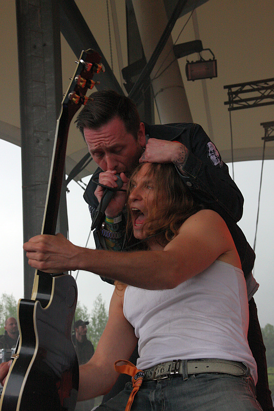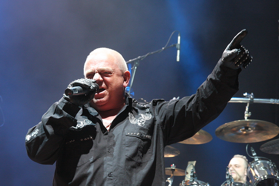 ein (mäßig spannendes) Solo zum Besten geben müssen, sei mal dahingestellt. Möglicherweise ermöglichen sie ihrem Chef damit aber auch nur eine Atempause. Der ist zwar stimmlich immer noch auf der Höhe, aber der mittlerweile zu stattlicher Größe angewachsene Dirk-Bach-Gedächtnis-Bauch schränkt den Ex-ACCEPT-Sänger doch sichtlich in seiner Bewegungsfreiheit ein. Meist steht er während der Instrumentalpassagen nur statisch im Hintergrund und Ansagen gibt es so gut wie gar keine. Man wird eben nicht jünger…Was die Songauswahl angeht, fallen zwei Dinge auf. Erstens haben die älteren U.D.O.-Songs wie "They Want War" (natürlich ohne Kinder-Chor), "Time Bomb" oder "Animal House" deutlich mehr Substanz als die neueren Stücke, echte Langeweile entsteht aber aufgrund der ansteckenden Spielfreude der Band trotzdem nicht. Zweitens sind die insgesamt vier ACCEPT-Songs zur allseitigen Zufriedenheit tatsächlich ausreichend, zumal mit "Screamin’ For A Love Bite" ein Titel ausgegraben wird, der weder bei den ACCEPT-Festival-Gastspielen von 2005 noch 2010 auf der Setlist vertreten war. "Head Over Heels", "Metal Heart" und der obligatorische Schlusspunkt "Balls To The Wall" runden einen sehenswerten und durchaus Headliner-würdigen Auftritt ab. (LK)