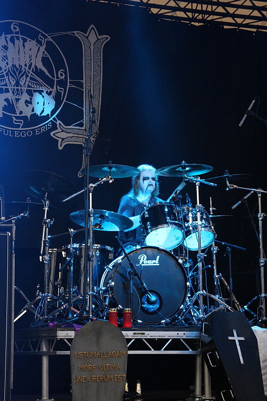 Nach dem stimmungsvollen Auftritt beim Hell Over Hammaburg wurden DENIAL OF GOD kurzerhand als Ersatz für die pausierenden oder aufgelösten (die Sachlage ist da wohl noch unklar) NACHTMYSTIUM verpflichtet - auch weil das aktuelle, erst zweite Album "Death And The Beyond" im Rock Hard Shop guten Absatz findet. Die schon etwas älteren Dänen, die auf Platte als Trio agieren und sich live mit zwei sichtbar jüngeren (und bemühten) Musikern verstärken, wirken bei Tageslicht aber ein bisschen weniger ernstzunehmend, als auf einer dunklen Clubbühne. Die Bühnendeko mit den Grabsteinen der einzelnen Mitglieder und den nicht angezündeten Grableuchten sieht dann doch etwas billig aus und auch die Outfits sind jetzt nicht so richtig cool. Sechs Songs in 45 Minuten deuten an, dass das Songmateriel von DENIAL OF GOD eher langatmig ist und so wird die Mischung aus Black Metal und traditionellem Heavy Metal eher wohlwollend als wirklich begeistert aufgenommen. Zumindest unten vor der Bühne, hier und da hört man auf den Rängen auch leicht spöttische Meinungsäußerungen. Vier Songs vom aktuellen Album, "The Book Of Oiufael" vom Debüt sowie der EP-Track "Robbing The Grave Of The Priest" werden bei ordentlichen Soundverhältnissen geboten und auch wenn die Band hier sicher nicht abräumt, wird sie den einen oder anderen Fan dazu gewonnen haben. (ASZ)