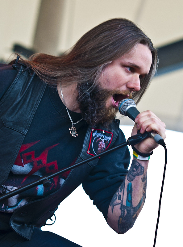 Die ist bekanntermaßen ein bisschen stumpfer und simpler - perfekt also, um die Meute anzuheizen. Mit seiner voluminösen Gesichtsbehaarung sieht Fronter Iron Tyrant zwar recht sludigig aus, während Gitarrist Iron Incubus mit ANGEL WITCH-Shirt, Schlaghose und Les-Paul-Gitarre auch nicht gerade thrashig aussieht, der Patronengurt reißt es aber noch heraus. Die Optik ist aber nebensächlich, die Band ist nämlich reichlich bemüht, das zahlreich versammelte Publikum in Fahrt zu bringen und gibt mit "Conquerors Of Black Souls" ordentlich Gas. Vom Debüt "Slaves Of The Burning Pentagram" gibt es noch die beiden Nummern "Eternal Tyranny" und "Claw Of The Reaper", die anderen vier Songs sind vom Zweitwerk "Bloodrust Scythe". Das ordentlich rockende "Orgasmic Rush" und das abschließende "Night Of The Possessed" ragen dabei nochmal heraus. Die Leute haben jedenfalls Bock auf die Band, recken Fäuste und Hörner, lassen Haare fliegen und starten kleinere Pits. Trotzdem schade, dass der Sound nur mau ist, was die Band sich in gewisser Weise aber selber zuzuschreiben hat - denn Thrash mit nur einer Gitarre klingt per se immer ein bisschen dünner. Trotzdem ein guter Einstieg ins Festival. (ASZ)