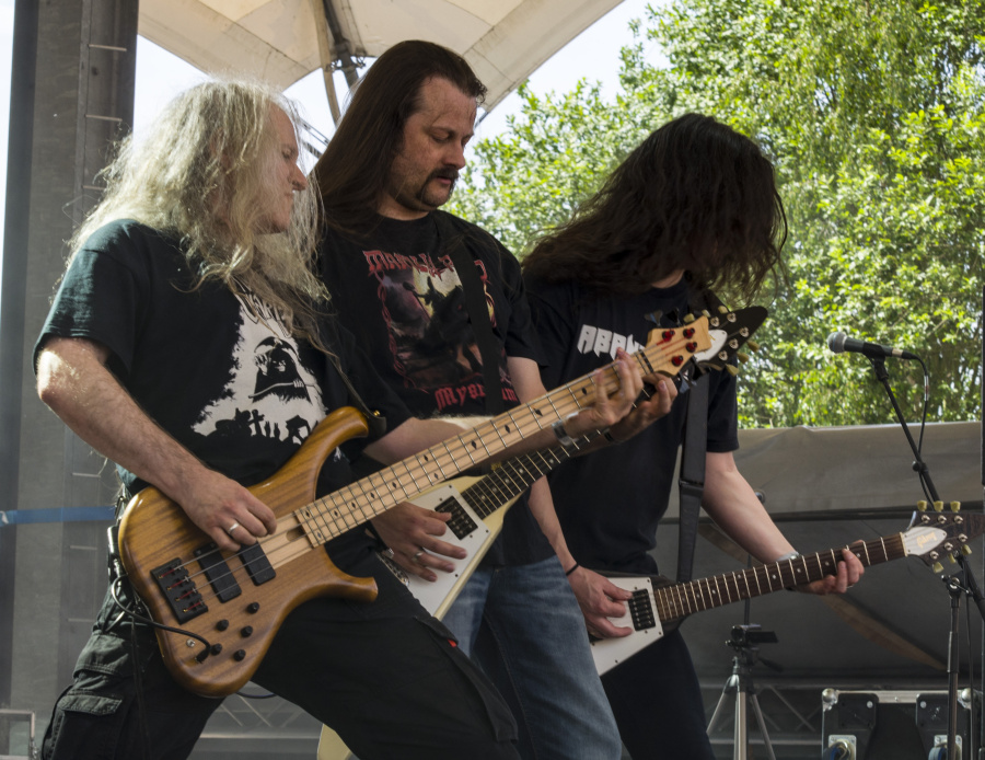 Ziemlich unglaublich, wie wenige mit dem Namen ROXXCALIBUR vor ihrem Auftritt als Opener des zweiten Festivaltages was anfangen können. Nun gut, wir sind hier nicht auf dem Keep It True oder dem Headbangers Open Air, aber um so mehr wird es Zeit für eine intensive Unterrichtsstunde in Sachen NWOBHM. Die Zahl der Wissbegierigen auf den Rängen ist zur Mittagszeit allerdings noch recht niedrig, dafür stehen vor der Bühne doch schon einige Fans, die den Fortgeschrittenenkurs gebucht haben und schon ziemlich gut mit dem Programm der Coverband, die mehr ist als eine Coverband, vertraut sind. Das auf einer Position überraschend neu besetzte Quintett eröffnet sein Programm mit "Witchfinder General" und hat von Anfang an sichtlich Spaß an seinem Auftritt. Während Schlagzeuger Neudi, jetzt schon länger auch in Diensten seiner eigenen Helden Manilla Road, gleichzeitig Zigarillo r