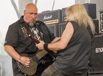 Es grenzt an ein Ding der Unmöglichkeit etwas zu einem OVERKILL-Auftritt zu schreiben, ohne zu erwähnen, dass sie eine der besten Livebands der Szene sind. Das stellen die Thrash-Veteranen natürlich auch im Amphitheater wieder unter Beweis. Der Einstieg mit „Armorist“ ist nicht erstaunlich, aber direkt im Anschluss gibt es mit „Hammerhead“ dann doch schon eine Überraschung. Und davon gibt es in Form von „End of the Line“ und dem im Rahmen von „Fuck You“ gecoverten „Take on the World“ noch ein paar weitere. Blitz gibt natürlich wie immer Vollgas – wobei das wahrscheinlich selbst dann im Vergleich zu anderen Frontmännern noch so wirken würde, wenn er mal nur die Hälfte seines Potentials ausschöpft. Ansonsten dient tatsächlich nur D.D. als Blickfang, da die Gitarrenfraktion (besonders Derek Taylor) ein bisschen unmotiviert wirkt. Das (wie auch das Fehlen von „Wrecking Crew“) ist allerdings zu verschmerzen, da es ansonsten wirklich überhaupt nichts zu kritisieren gibt. OVERKILL sind und bleiben live eine Bank.