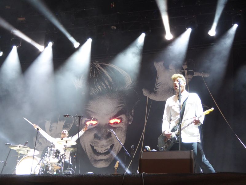 Genauso energiegeladen wie der Frontmann agiert Gitarrist Nicholaus Arson (der hinter der Rockstarfassade auch Almqvist heißt und Pelles Bruder ist), der ordentlich Stoff gibt und allerhand irre Posen und Grimassen auf Lager hat. Für die beiden Derwische ist die Bühne fast schon zu klein, sie suchen nach immer neuen Orten auf und vor der riesigen Big Stage und lassen sich auch gerne mal vor den großen Videoleinwänden an den Seiten sehen. Dahinter verblassen die anderen THE HIVES-Mitglieder ein bisschen, dafür liegt bei ihnen die Hauptarbeit für den professionellen Sound. Heute haben sich die Fünf für weiße Anzüge entschieden, Zylinder und weitere Accessoires sind zuhause geblieben. Und auch wenn die Alben des Fünfers gerade in letzter Zeit kaum mehr überzeugen können: THE HIVES sind live eine Bank.