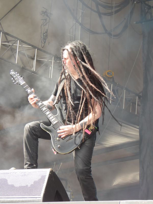 Danach führt der Weg ein weiteres Mal zur Boom Stage, auf der PARADISE LOST ein 45-minütiges Set präsentieren. 15:20 Uhr, die Sonne scheint, vorher gab es Pop, danach BABYMETAL, sprich: die Rahmenbedingungen sind auch hier nicht ideal. Aber der Gig ist sowieso eher als Promoaktion für das neue Album „The Plague Within“ zu verstehen, das tags zuvor erschien. In unserer Massenreview stieß die Rückkehr zu alten Trademarks auf ein geteiltes Echo, dem Livebetrieb kommt das neue Material jedoch zu Gute. ‚No Hope In Sight‘ und ‘Terminal’ feierten gestern bei Rockavaria ihr Debüt und fügen auch der heutigen Show genauso wie das ebenfalls neue ‘Victim Of The Past’ ein paar Schwarzschattierungen hinzu. Der barttragende, kurzgeschorene Nick Holmes hat bei seinen ersten Erfahrungen außerhalb von PARADISE LOST Blut geleckt (oder doch in rauen Mengen konsumiert?) und growlt nun in bester BLOODBATH-Manier wieder häufiger ins Mikro. Den zu den von Hoffnungslosigkeit geprägten Texten passenden Musikanteil stellt Greg Mackintosh bereit, der mit seinem Nebenprojekt VALLENFYRE ebenfalls wieder Death Metal-Wurzelsuche betreibt.