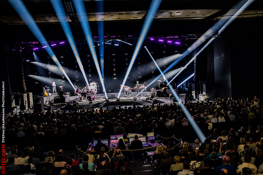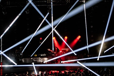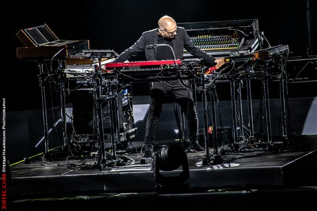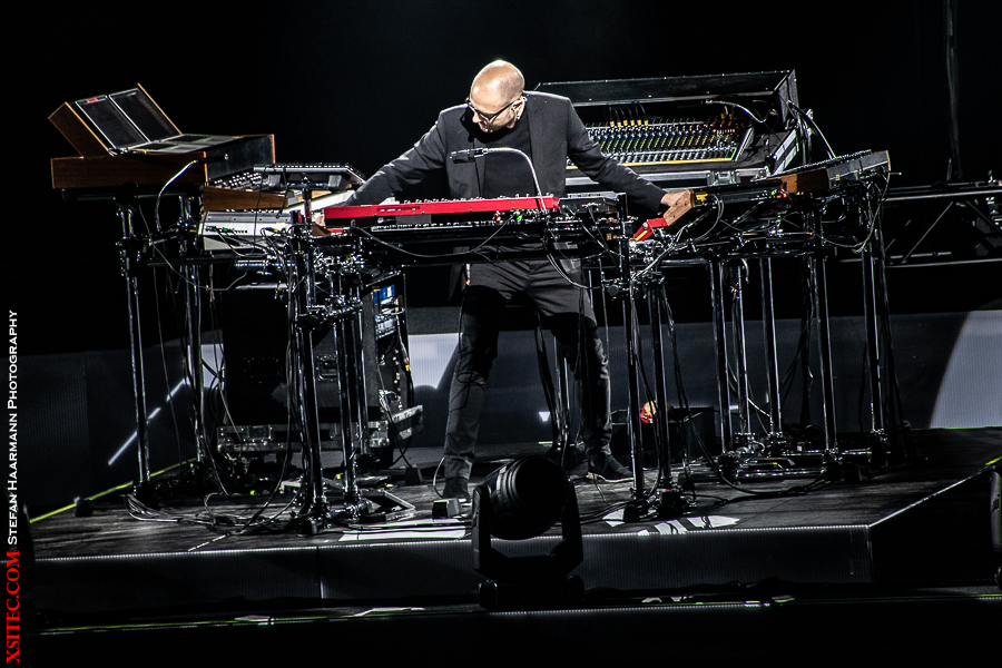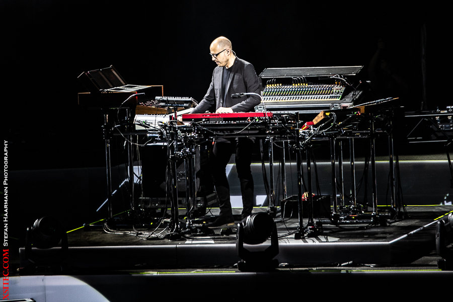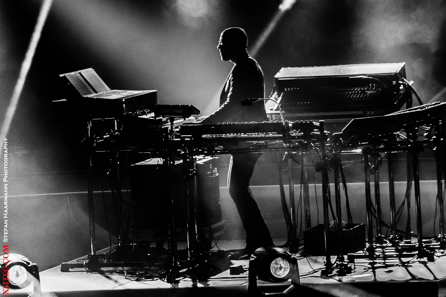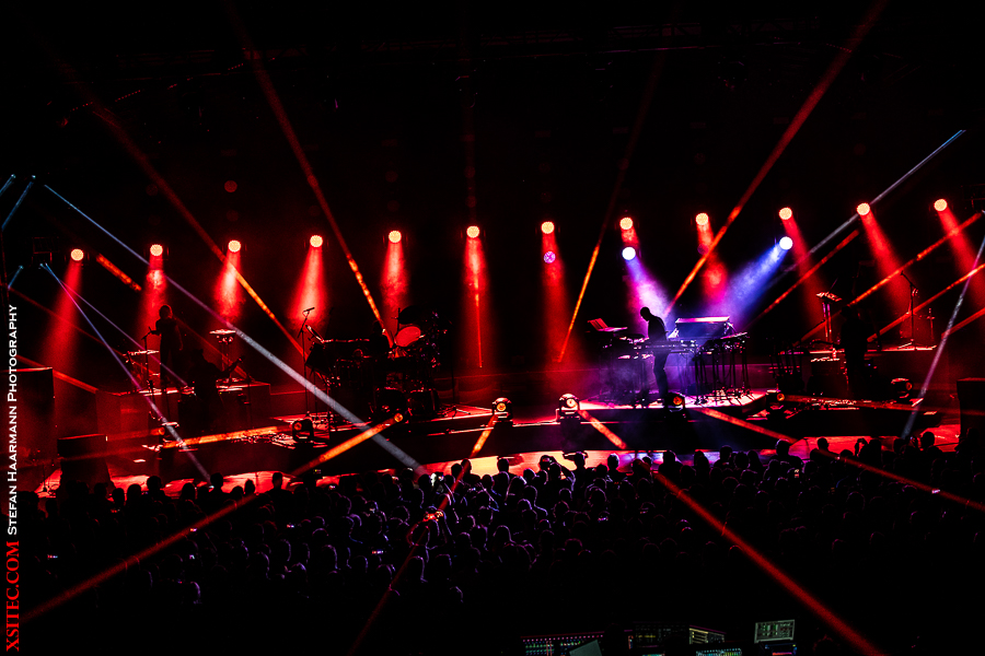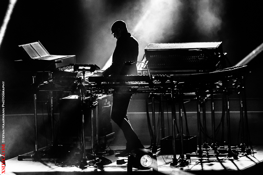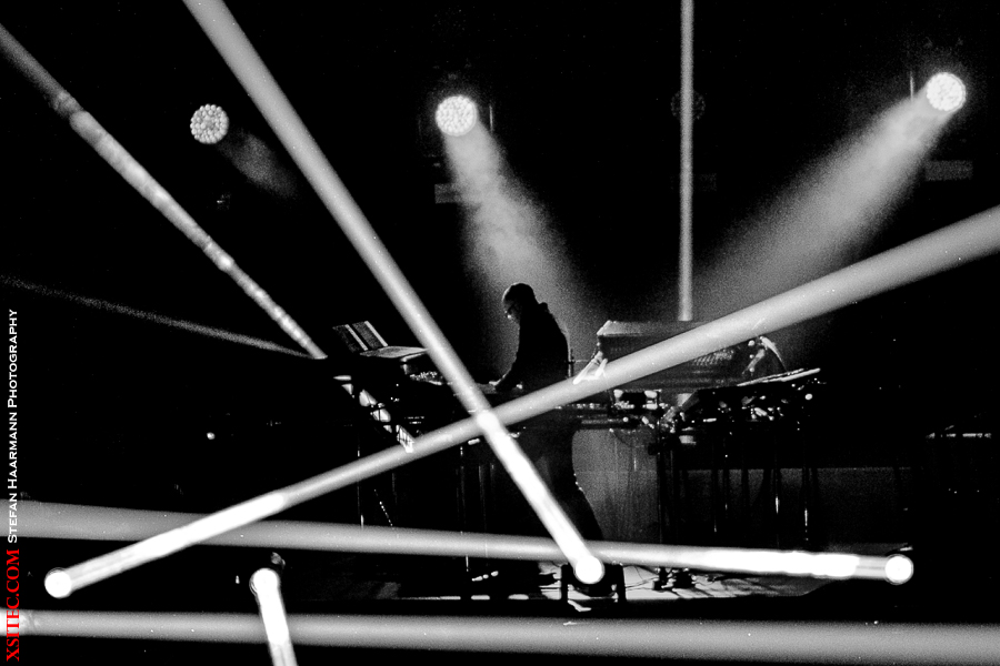 Pünktlich um 20.00 Uhr geht das Licht der Jahrhunderthalle aus und zu wummernden Bässen zucken Lichtblitze durch´s weite Rund, die die Location in ein faszinierendes Lichtspiel tauchen. Dass die Musiker bereits auf ihren Plätzen zu ihren Instrumenten gegriffen haben, kann man zunächst nur ahnen, da die Lichteffekte anfangs keine klare Fokussierung der Augen zulassen. Erst mit der Zeit lassen sich die Musiker auf ihren Podesten ausmachen. Christopher von Deylen, dessen beeindruckendes Keyboard-Arrangement gefühlte 20 m2 Bühne einnimmt, bearbeitet in schwarzem Sakko die Tasten.