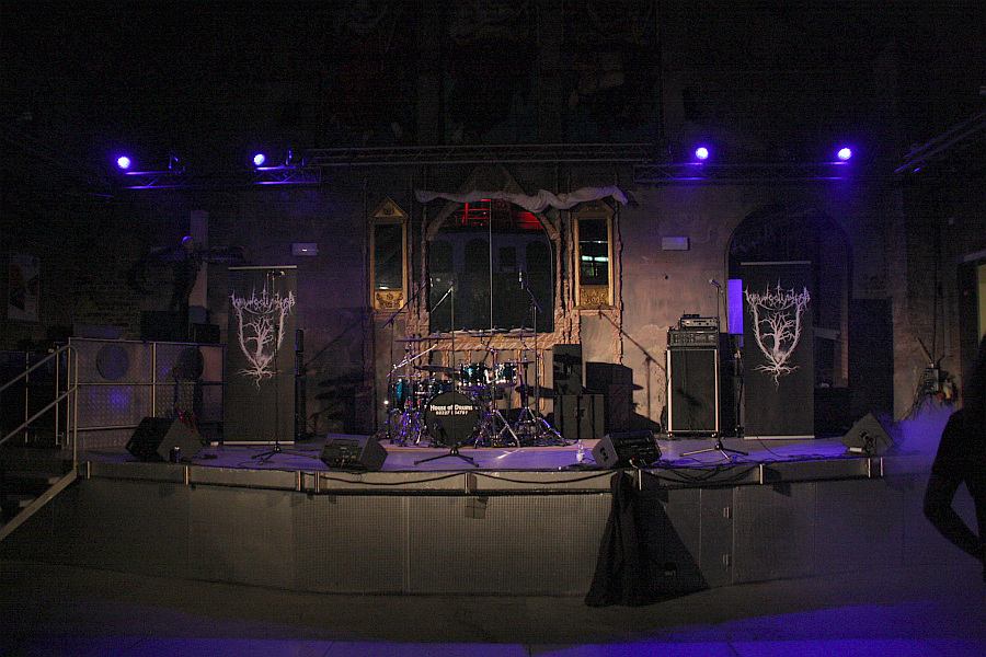 Die Macher des Festivals sind seit Frühjahr 2011 in Sachen Live-Events tätig und stellen regelmäßig interessante Konzerte aus dem modernen Extrem-Metal-Bereich auf die Beine. Eine gewisse Erfahrung ist also vorhanden, insofern überrascht es, dass man bei Stage Secrets Festival kein sonderlich gutes Händchen bei der Auswahl der Tontechniker hat. Zwar haben die meisten Bands einen zumindest passablen Sound, doch oft dauert es eine kleine Ewigkeit, bis man dorthin gekommen ist. Vor allem die Umbaupause vor NOCTE OBDUCTA zieht sich scheinbar endlos und stellt die Besucher auf eine Geduldsprobe. Defekte Mikrofone und Kabel, Monitorboxen, die keinen Mucks von sich geben, Probleme mit der Einstellung der Monitore – alles keine Riesenprobleme, die aber leider nicht schnell gelöst werden können. Ein weiterer Kritikpunkt ist bei der Beleuchtung der Bühne zu sehen. Zwar mag es der Atmosphäre förderlich sein, wenn möglichst wenig Licht die Bühne erhellt, doch bei den meisten Bands war es so wenig Licht, dass man ohne High-End-Equipment kaum in der Lage war, ohne Blitzlicht vernünftige Fotos zu machen – was man an den Bildern in diesem Bericht sehen dürfte. Und Bilder, die mit Blitz geschossen werden, sind einfach zu leblos.