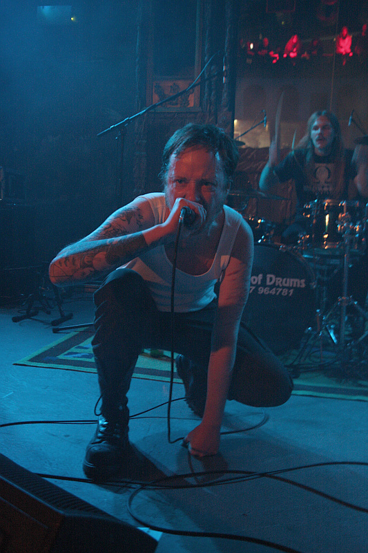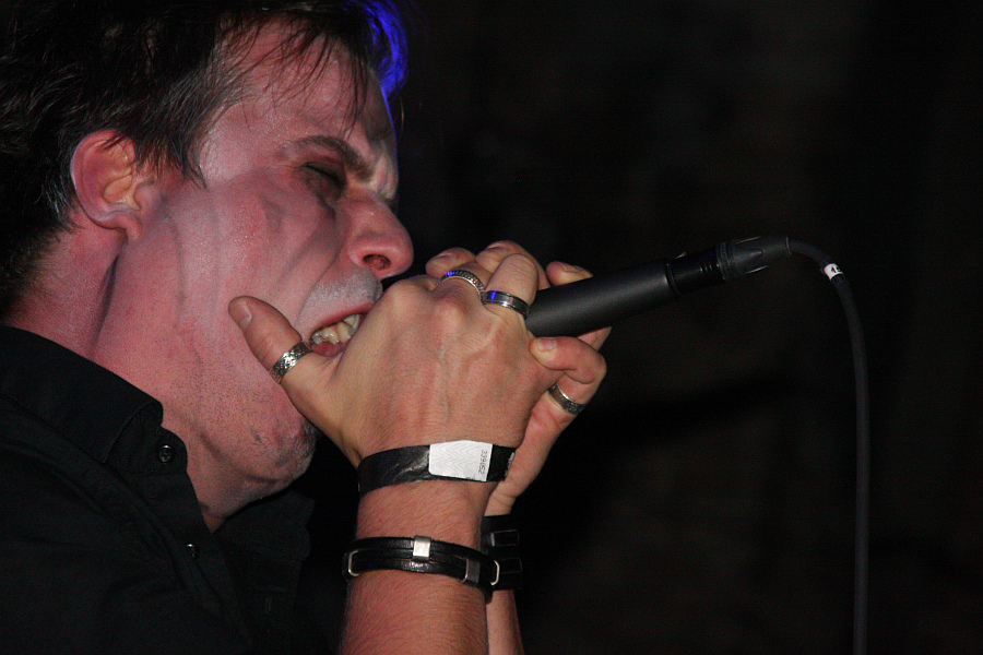 Ganz im Gegensatz zu FÄULNIS. Die zocken eine punkig-rockige Variante von suizidalem Black Metal und haben den wohl auffälligsten Frontmann des Tages in ihren Reihen. Seuche nennt der Knabe sich und besticht zunächst durch seine Optik: kurze Haare, Oberlippenbart und ein weißes Wifebeater-Unterhemd, das seine vernarbten Oberarme besonders gut zur Geltung bringt. Sieht schön asozial aus und auch mit seiner gesamte Gestik und Mimik stellt er den durchgeknallten Irren mehr als überzeugend dar. Offensichtlich haben FÄULNIS auch eine entsprechende Anhängerschar – selten hat man so viele Leute mit geritzten und vernarbten Armen in den ersten Reihen eines Konzerts gesehen. Und die Zerschnittenen bejubeln den Auftritt frenetisch und singen die Songs begeistert mit. Man kann natürlich geteilter Meinung darüber sein, wie sinnvoll es ist, selbstverletzendes Verhalten und die damit einhergehende psychische Störung so demonstrativ zur Schau zu stellen (Stichwort Nachahmer), aber in gewisser Weise macht das auch stark den Reiz dieser Band aus. Seuche schreit, brüllt, gröhlt und leidet sich mit Inbrunst durch die eingängigen, wirklich gut rockenden Songs seiner tight aufspielenden Band und pöbelt Leute an, die NSBM angeblich nur wegen der Musik hören. Im kurzweiligen Set ragen vor allem die Songs „30. Juli, bewölkt“, „Gespien“ und „Landgang“ heraus und so kontrovers es auch sein mag, ist der Auftritt von FÄULNIS komplett stimmig und deshalb bei aller Geschmackssache ein Tageshighlight.