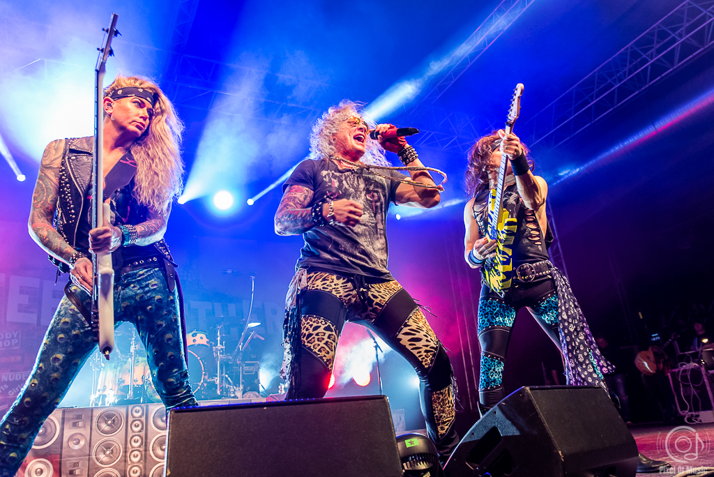 Ok, kommen wir noch einmal zum Headliner der Show. Steel Panther fingen relativ pünktlich an. Die ersten drei Songs, die von den Medienvertretern fotografiert werden durften, zogen sich fast über eine halbe Stunde. Nein, es waren keine epischen Prog-Songs, die da gespielt wurden, sondern eine epische Laberei. Gleich beim zweiten Song fing Gitarrist Satchel an über „Muschi’s“ zu philosophieren und natürlich auch zu singen. Das alles auf eine mehr als ungewöhnlich vulgäre Art und Weise. Also ich haue ja auch hin und wieder mal einen Chauvi-Spruch raus, aber das war selbst für mich "too much". Interessanterweise fuhren die Fans da voll drauf ab. Selbst die weiblichen Besucher, die oft sehr direkt von Michael und Satchel angesprochen wurden, und sich später zu „17 Girls In A Row“ auf Wunsch der Band in Massen auf der Bühne tummelten, waren sichtlich begeistert.