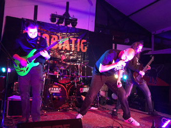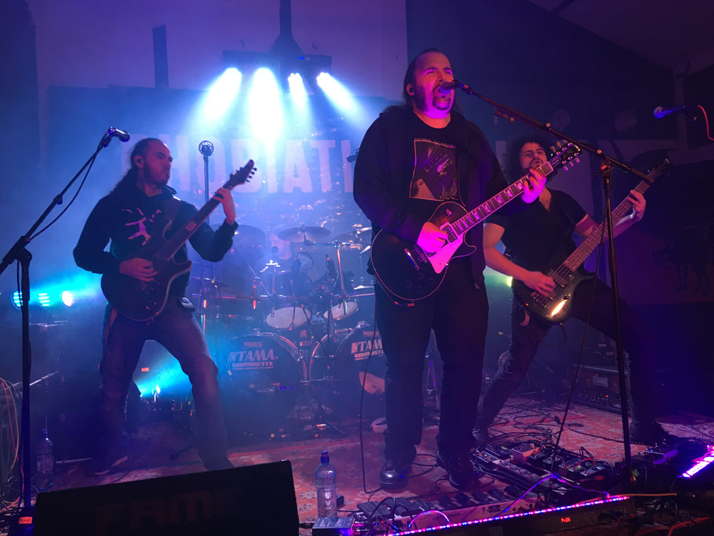 Mit brutalem technischen Death Metal kann man mich für gewöhnlich jagen, insofern erwarte ich nicht, dass mir PHOBIATIC aus Essen imponieren - doch weit gefehlt: Was die Herren aus dem Pott abliefern, muss nicht gefallen - doch mindestens beeindrucken. Denn was Kai Bracht am Schlagzeug und Robert Nowak an der Gitarre an irrer Geschwindigkeit vorlegen, ist mitunter abartig - macht jedoch einen Mordsspaß, denn es passt alles wie der sprichwörtliche Arsch auf den Eimer. Im Vergleich dazu agiert Bassist Christian Neumann nahezu entspannt, während er dem Ganzen mit variablem Spiel Druck verleiht, und der hünenhafte Sänger Sebastian Meisen von Anfang an den Kontakt zum Publikum sucht. Seine über dem Hochgeschwindigkeits-Death-Metal thronenden Grunts sind eine Wucht, von den Texten bekomme ich hingegen außer den Titeln nicht viel mit, wobei die Ansagen - "ein Lied über den Scheiß-Terror, den Scheiß-IS" - neugierig machen, ob z.B. "Heads Will Roll" den Schulterschluss mit Niles "Call For Destruction" sucht. Wie auch immer, der Auftritt der Ruhrpott-Deather ist spielerisch erhaben, dazu absolut sympathisch - nach über 30 Jahren im Metal finde ich unerwarteter Weise doch noch Zugang zum Brutal Technical Death. Darüber muss ich selbst schmunzeln, während der unausgeschlafene Raoul sich derweil als Frontrow-Banger für den folgenden Gig aufwärmt.