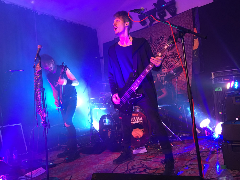 Zunächst müssen sich RAPTVRE auf dem engen Raum zurechtfinden, auf dem sie ihr Live-Debüt geben. Nach nur wenigen Songs geistert mir als Stilbezeichnung für ihre energisch-ruppige Darbietung "Hectic Metal" durchs Oberstübchen, denn die Band hastet die meiste Zeit durch ihren wuchtigen Set, und drosselt nur selten - dann jedoch effektiv - das Tempo. Ob es sich um ein Trio oder doch um ein Quartett handelt, ist mir nicht vollends klar, denn der geschminkte (Gast-?) Sänger tritt erst nach ein paar Minuten auf die Bühne, die er auch vor dem Rest der Band wieder verlässt, während Kirill Gromada an der Gitarre, Stefan Braunschmidt am Bass und Yannik Bremerich am Schlagzeug ihren gelungenen Bühneneinstand episch ausklingen lassen. Danach steht fest, dass vor allem der agile Kirill den Gesang auch gut und gerne hauptverantwortlich übernehmen könnte, ringt er seinen Stimmbändern doch ein breiteres Spektrum ab als der zwischenzeitliche Frontmann, der sich zudem erst in den Gig reinfinden und im Gegensatz zu seinen Nebenmännern eine gewisse Unsicherheit ablegen muss. "RAPTVRE explores the abyssal depths of Black-, Death- and Progressive-Metal with a dissonant and abrasive twist", so die Band über sich selbst auf zeitgenössischen Kanälen; sooo progressiv erscheint mir der leidenschaftlich Arsch tretende Metal hingegen (noch) nicht, doch nach einem kurzen, intensiven Gig bin ich gespannt, womit RAPTVRE um die Ecke kommen werden... a dream inside a dream? Ihr Debüt-Album soll wohl in diesem Jahr erscheinen.