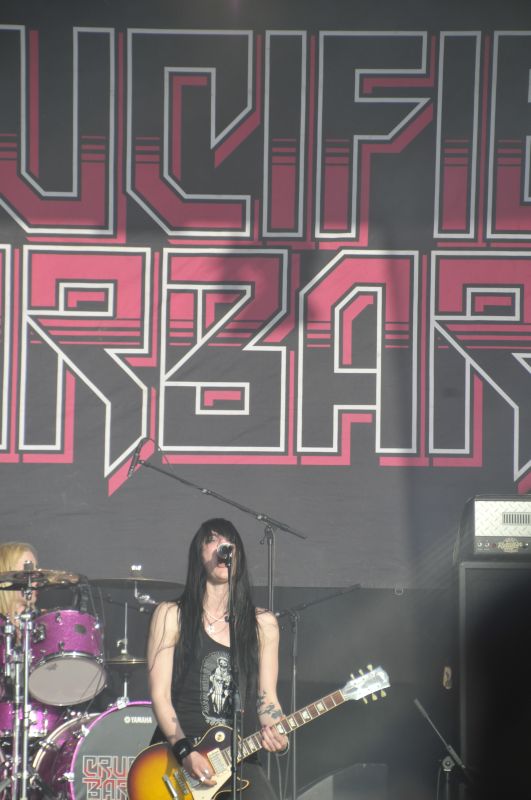 Es war erwartungsgemäß voll, sehr voll, man verteilte sich sogar in die Gänge bei den Fressbuden weiter hinten. Die Damen rund um die dunkelhaarige Frontfrau Mia sind professioneller geworden, ohne Frage. Ich hatte sie nun eine Weile nicht mehr live gesehen, habe nur das Debutalbum "In Distortion We Trust" im Schrank und war dementsprechend gespannt auf die Live-Qualitäten der Songs aus dem letzten Album "Till Death Do Us Party" und dem ganz neuen Album "Midnight Chase". Und musste erstaunt feststellen, dass die Songs des neuen und des Albums davor mächtig Arsch treten. Sie haben ihren Stil nicht aufgegeben, es ist immer noch derbe rockender Metal, nur weiterentwickelt. Die neuen Songs werden ebenso gefeiert wie die alten Klassiker "Play Me Hard", "Rock´n Roll Bachelor", "Losing The Game" oder "In Distortion We Trust". Fazit: völlige Bühnen-Fehlbesetzung, CRUCIFIED BARBARA gehören längst nicht mehr auf die kleinste der fünf Bühnen. Die Songs sind derber Rock´n Roll, die Mädels haben es immer noch drauf! Prima!