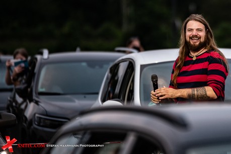 Am heutigen Abend jedoch ist vieles anders - vorbei die Zeiten, als man im Publikum dichtgedrängt stehen und feiern konnte. Die Kolonne der Autos steht im Halbkreis um die Bühne, die leichte Lockerung der Hygienevorschriften erlaubt glücklicherweise, dass die Besatzungen der jeweiligen Vehikel immerhin vor oder neben ihren Auto stehen können. Wie schon bei Mr. Hurley und Mr. Irish Bastard gibt es zur Freude der Fans einen Merch-Stand, der sich zunächst im Schritttempo durch die Reihen bewegt, im weiteren Verlauf aber einfach stehenbleibt, denn die extra für die fünf Konzerte umfassende VERSENGOLD Autokino Sommertour 2020 aufgelegten T-Shirts finden reißenden Absatz.