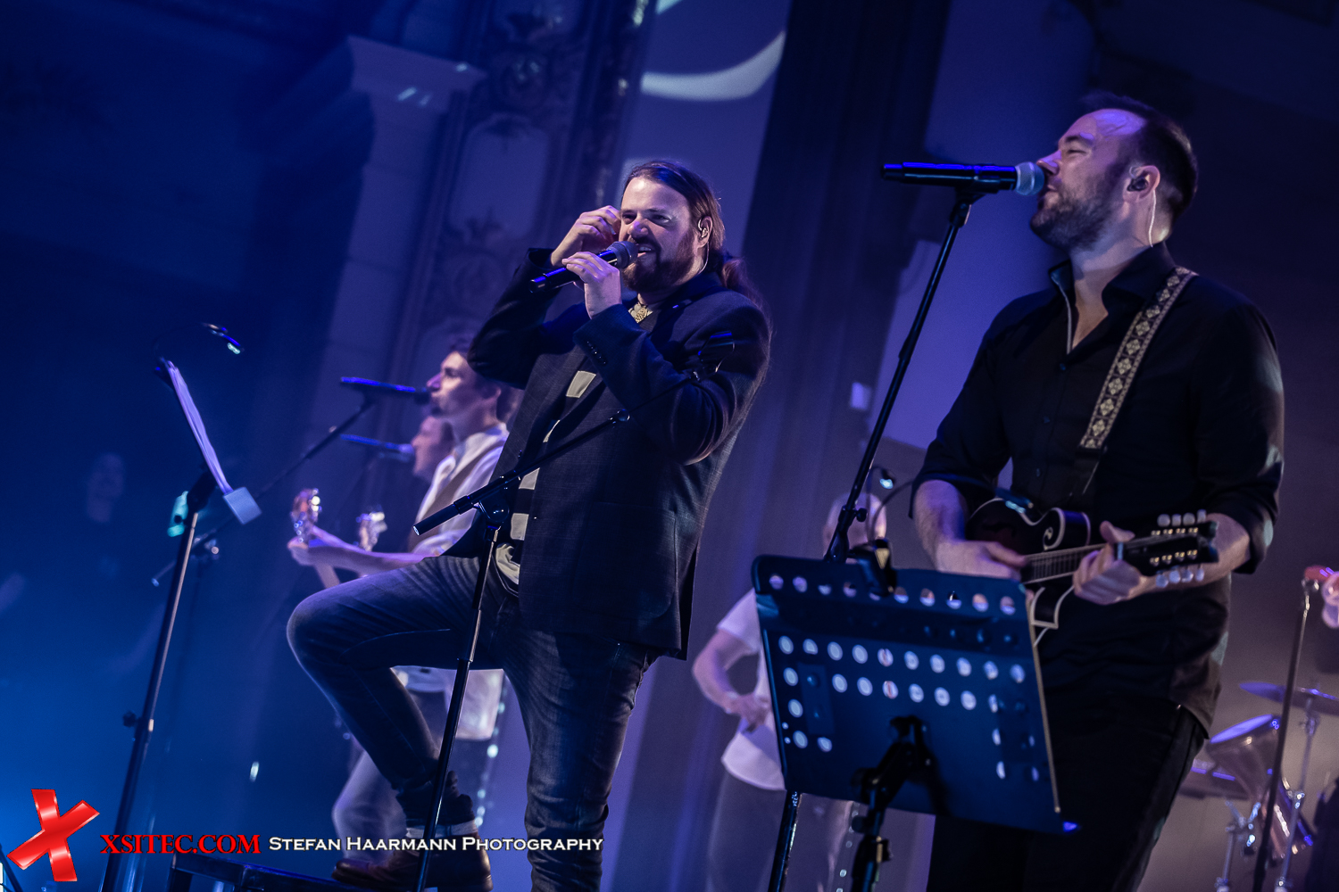 Als Auftakt dieses denkwürdigen Abends haben VERSENGOLD „Auf in den Wind“ gewählt. Die Bühne ist in ein tiefes Blau gehüllt, Nebelschwaden umwabern die Musiker, dazu sorgt der eindringliche Text, der die Geschichte eines Schiffbrüchigen, der in den Tiefen des Meeres seinen Tod findet erzählt, für die ersten Gänsehautmomente des Konzerts, denen noch zahlreiche weitere folgen sollen. Überhaupt beherrscht zunächst eine tiefe Melancholie die Szenerie, denn wo in einem „normalen“ VERSENGOLD Konzert die Party-Songs der Band abgefeiert werden, gibt es traditionell auf der Nacht der Balladen epische Geschichten zwischen Leben, Liebe und Tod.
