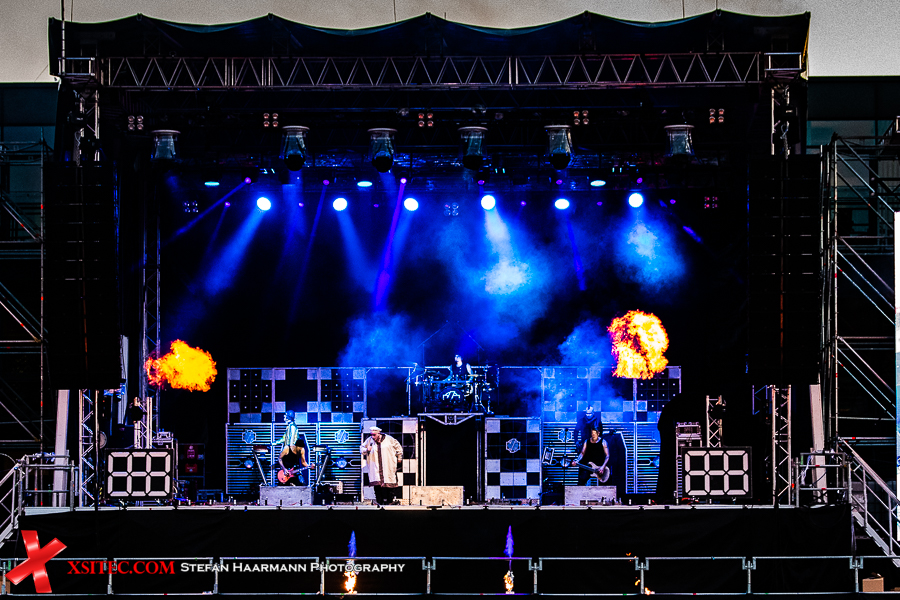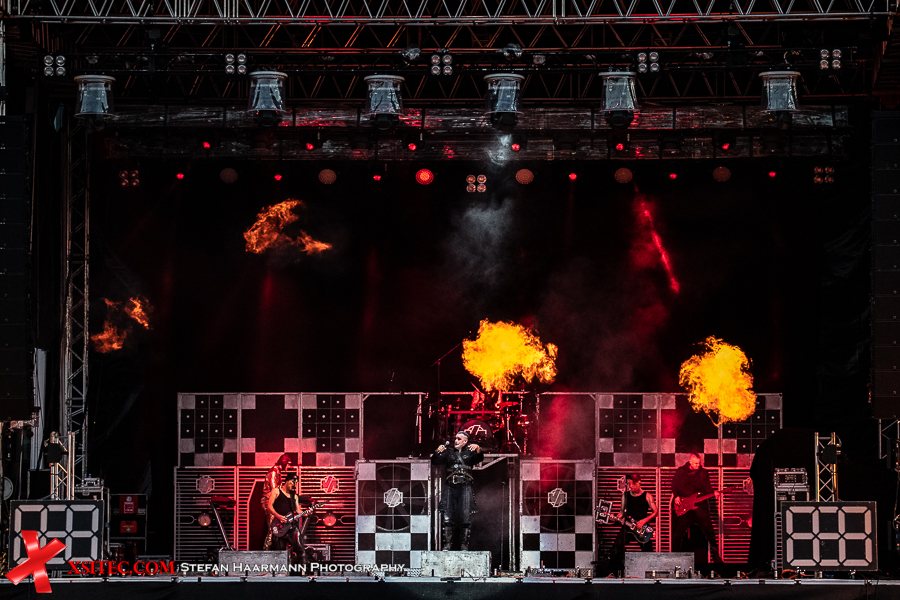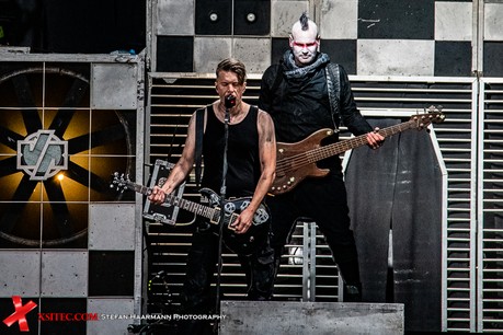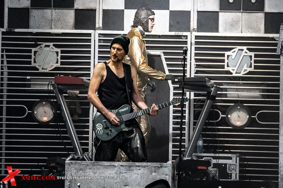 Gestartet wird die Show mit einer brachialen Version des RAMMSTEIN-Klassikers „Rammlied“, in den die Band scheinbar ihre über die vergangenen Monate angestaute Spielfreude hineinlegt. Und während die Band in der Lanxess-Arena durch die Form der Bühne zu reichlich Improvisationen gezwungen war, sorgt die hier im SparkassenPark installierte Großbühne für das gewisse Momentum der Behaglichkeit seitens der Protagonisten, die daher auch wie entfesselt aufspielen. Die ersten Pyros tauchen die Szenerie in ein Meer aus züngelnden, blitzenden Lichtern, was die Zuschauer mit tosendem Applaus quittieren, „Feuer frei“ direkt im Anschluss ist ja schon aufgrund des Titel zu einer Steigerung prädestiniert, was auch in der Umsetzung prächtig gelingt.