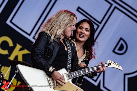 Bei der nächsten Band sind sich allerdings die meisten meiner Kollegen einig: da müssen wir hin. Gemeint sind hier THUNDERMOTHER, die ich bereits wenige Tage zuvor auf dem ROCKHARZ begutachten konnte und die hier selbstverständlich auch wieder auch meiner Liste stehen. Auch wenn der Begriff Band der Stunde abgedroschen erscheinen mag: die Damen um Frontlady Guernica Mancini beweisen erneut ihr tolles Potential und präsentieren im Laufe der Show Titel ihres neuen Longplayers „Black And Gold“, die noch ein wenig stärker erscheinen als die bisher bekannten Tracks.