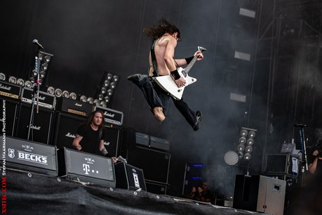 Bei meinem Eintreffen, betreten MONARCH die HISTORY-Stage und fegen die Halle so richtig durch. Um den Weg zu den Hauptbühnen rechtzeitig zu schaffen, breche ich nach der Hälfte des bärenstarken Gigs auf und bahne mir den Weg durch die Massen, die gut gelaunt zwischen den neun Bühnen des Geländes pendeln. An der HARDER-Stage angekommen, gibt es die Gelegenheit, mit den Kollegen die Eindrücke der ersten Bands des Tages auszutauschen. Es ist immer wieder interessant zu erfahren, wer welche Prioritäten setzt und vor allem: warum. Bei AIRBOURNE sind sich indessen alle einig: muss man gesehen haben.