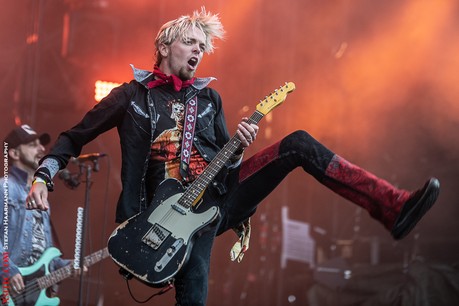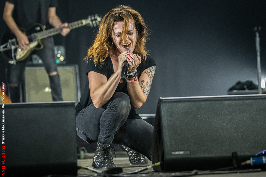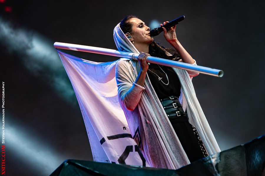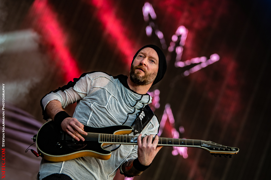 Pünktlich zum Start der Abendkonzerte, reißt dann auch die bis dato dichte Wolkendecke auf und taucht das Infield in goldene Farbtöne. Mit den Niederländern von WITHIN TEMPTATION steht eine Band auf der Bühne, die den Symphonic Metal schon seit ihrer Gründung im Jahr 1996 prägen. Auch das aktuelle Album „Resist“ thront weit über dem Durchschnitt des Genres. Sharon den Adel und ihre Mitstreiter habe daher auch keine Mühe, das Infield, das nun wieder rappelvoll ist, auf ihre Seite zu ziehen. Neben der Frontfrau, die stets für die Showelemente zuständig ist, liefert auch ihre Band gnadenlos ab. Stefan Hellenblad, der die fetteste Axt aus dem Haus Jackson Guitars sein Eigen nennt, hämmert auf ein Instrument ein, das statt der gewöhnlichen sechs Saiten, derer acht besitzt. Das Bild hier im Fließtext wurde von ihm und auf dem offiziellen Intagram-Accout von WITHIN TEMPTATION geteilt, was den Fotografen selbstverständlich extrem erfreut hat.