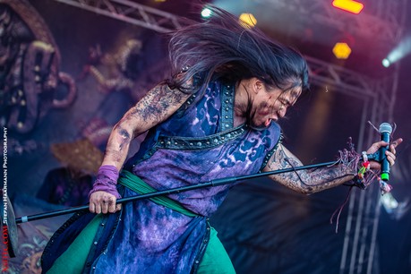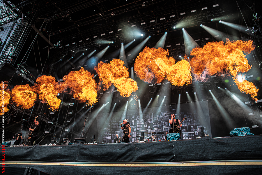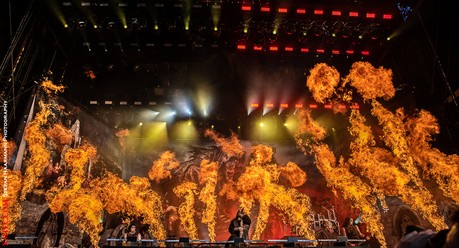 Auch bei SUBWAY TO SALLY ist das Infield zum Bersten gefüllt. Nachdem sich der Frontmann seines Goldsakkos entledigt hat, gibt es diverse Pyro-Elemente, die auch im Bühnengraben noch für Hitzestöße sorgen. Neben den mittelalterlichen Instrumenten liefern auch die Stromgitarren und die Rhythmussektion ihren Beitrag zu den Songs, die von der Menge gefeiert werden. Auch zu dieser frühen Stunde ist richtig Stimmung im weitläufigen Infield.