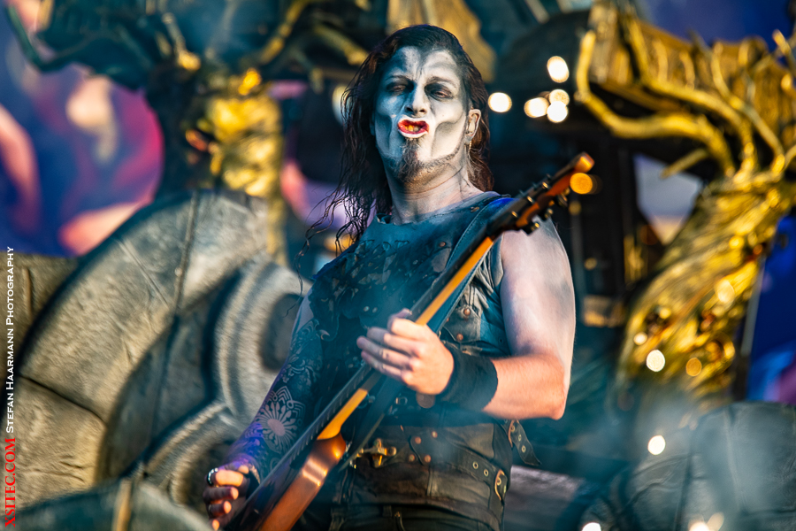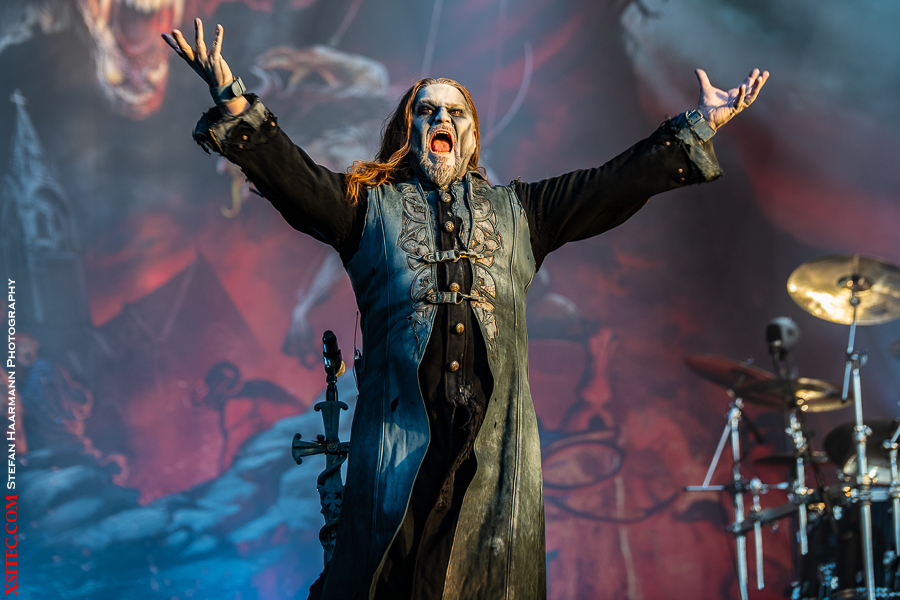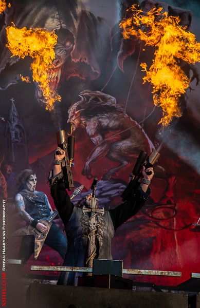 Zunächst einmal stehen die Jungs von POWERWOLF auf dem Programm. Obwohl die Sonne noch hoch am Himmel steht, ist es an der Zeit, für Atilla Dorn und sein Wolfsrudel, die Metal-Messe zu zelebrieren. Die Gebrüder Greywolf, Roel van Helden, sowie Einpeitscher Falk Maria Schlegel kommen nach dem Intro unter Einsatz der ersten Feuerwerkskörper zu den Klängen von „Fire And Forgive“ auf die FASTER-Stage. Atilla Dorn packt dann zur Mitte des Songs die Flammenwerfer aus und brennt imaginäre Löcher in die Abendluft. Ein Spektakel, das zu späterer Stunde sicher noch eindrucksvoller gewirkt hätte.