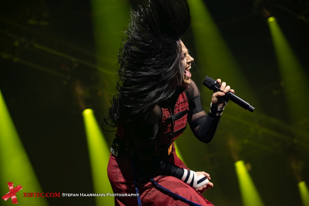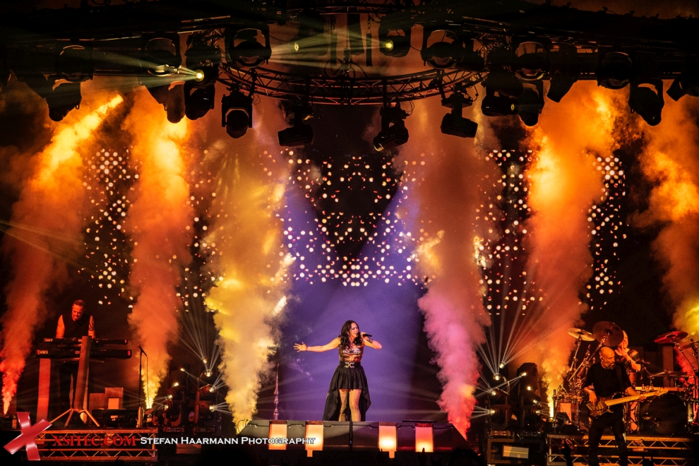 Nach diesem Paukenschlag geht es kurz darauf mit geballter Female-Fronted-Metal-Power weiter. Sharon den Adel betritt die Bühne in einer metallisch glänzenden Korsage. Dazu trägt sie eine schwarze Krone aus Metall, die nach dem ersten Song aber wieder in der Requisite verschwindet. Die LED-Wall im Hintergrund arbeiten nun nicht mehr nur in Form einer Silhouette, sondern bestahlt den kompletten Hintergrund, dazu werden auf den runden Monitoren zu beiden Seiten der Bühne immer wieder Video-Sequenzen eingeblendet.