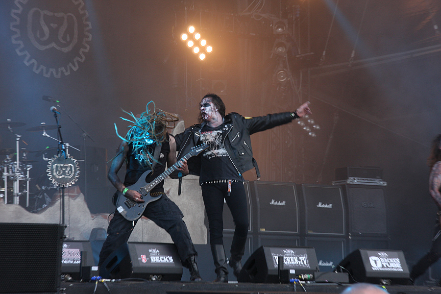Als nächster Programmpunkt steht ein Interview mit der doch sehr hübschen Sängerin von KOBRA AND THE LOTUS auf dem Plan, weshalb es leider nicht mehr reicht, um OPETH auf der Black Stage zu sehen. Stattdessen steht zunächst die Suche nach einem guten Platz, um DIMMU BORGIR zu sehen, an, immerhin möchte man ja nicht unbedingt mitten in einer der riesigen Pfützen stehen. Als der Platz gefunden ist, stellt man fest, dass man ja auch noch einen guten Blick auf die True Metal Stage hat, auf der