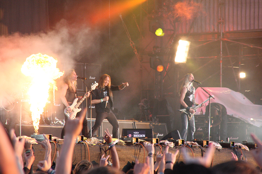 HAMMERFALL gerade ihr Werk verrichten. Hören tut man eh gut, da der Sound immer auch über die Boxen der Nebenbühne geleitet wird. Und etwas überraschend liefern die Schweden einen richtig guten Gig ab, an dem es so gut wie nichts auszusetzen gibt. Der Sound ist prima, die instrumentale Darbietung ziemlich tight und Frontmann Joacim Cans ist verdammt gut bei Stimme. Kein Wunder, dass die Stimmung hervorragend und ausgelassen ist und selbst vor der Black Stage stehen zahllose Fans und schütteln ihre Haare. HAMMERFALL zelebrieren nach eigener Aussage ihr 15-jähriges Wacken-Jubiläum und servieren dazu eine gelungene Setlist mit zahlreichen Hits wie "Heeding The Call", "Blood Bound", "Steel Meets Steel", "Renegade", "The Dragon Lies Bleeding", "Let The Hammer Fall" und "Hearts On Fire". Beide Daumen hoch für diese Performance, mit der HAMMERFALL ein bisschen die Überraschungssieger des diesjährigen Wacken Open Airs sind. Stark! (ASZ)
