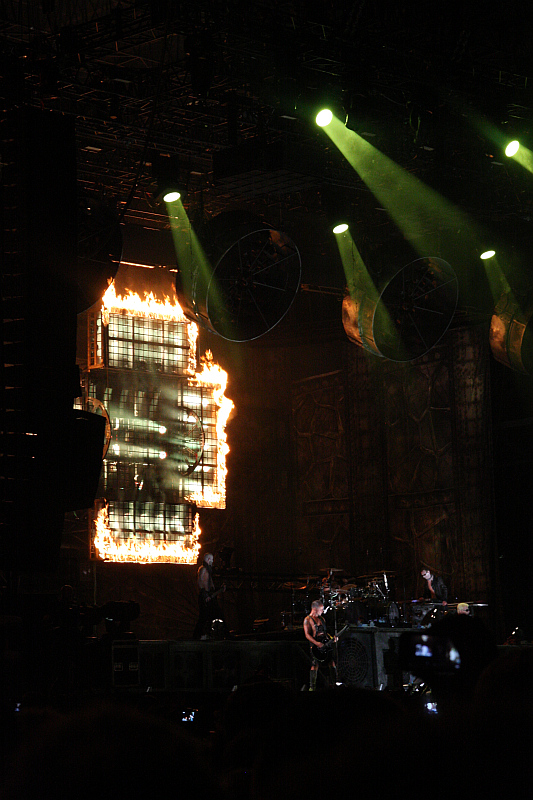 Derweil sorgen die Gitarristen Richard Kruspe und Paul Landers für das charakteristische Stakkato-Feuerwerk und peitschen die Songs mit einer unfassbaren Tightness nach vorne. Klar, bei RAMMSTEIN steht die Show im Mittelpunkt, die Musik wird trotzdem mit teutonischer Präzision und Martialität dargeboten. Kein Wunder, dass die Amerikaner auf diese Band mit vermeintlich urdeutschen Tugenden so abfahren. Dass RAMMSTEIN trotzdem nicht einmal ansatzweise in die rechte Ecke gehören, macht das auch an diesem Abend gespielte "Links 2-3-4" überdeutlich. Ein paar Fragen wirft die Performance von Sänger Lindemann trotzdem auf – nach dem Auftritt sind nicht wenige der Meinung, dass da nicht alles live gewesen ist, was man vom Gesang gehört hat. Und in der Tat wirkt es ein wenig seltsam, wenn man Gesang hört, obwohl der Sänger das Mikrofon weit weg vom Mund schwingt. Sei’s drum, selbst wenn es da Playback-Unterstützung gibt, trübt das den Gesamteindruck keineswegs. Erfreulich, dass die Setlist mit jeder Menge Songs der überragenden ersten drei Alben gespickt ist, während das nicht ganz so grandiose "Rosenrot"-Album nur in Form von "Benzin" berücksichtigt wird. Highlights der Show, die als Gesamtwerk wohl das Spektakulärste ist, was das Wacken Open Air je gesehen hat, sind "Mein Teil", bei der Lindemann als blutiger Metzger auftritt und Keyboarder Flake, der im Kochtopf sitzt, ordentlich Feuer unterm Hintern macht, "Bück dich" mit entsprechender (gestellter) A tergo-Penetration von Flake durch Lindemann in prominent erhöhter Position sowie der Riesenpenis, der beim