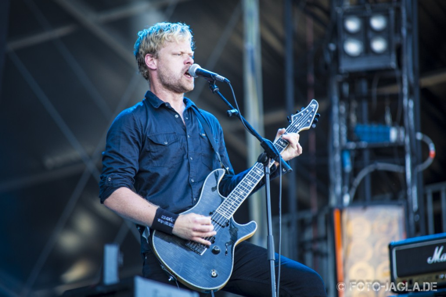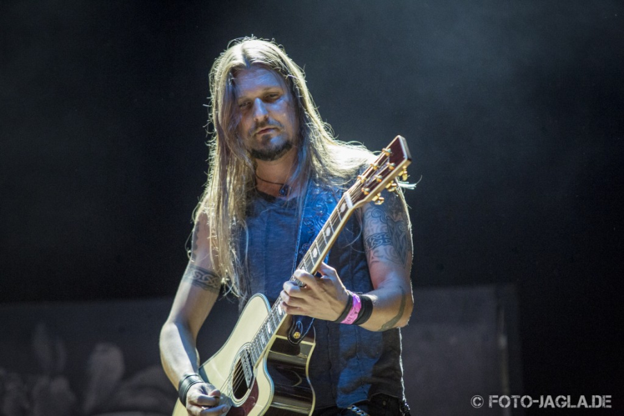 Also geht es mit AMORPHIS auf der Party Stage weiter, die eigentlich auf die Black Stage gehört hätten, dort sind allerdings die Gothic Rocker ASP zeitgleich zugange. Bei AMORPHIS kann man sich sicher sein, eine gute Show geboten zu bekommen, den Finnen gelingt jedoch eine faustdicke Überraschung. Denn der erste Teil des Sets wird komplett akustisch dargeboten. Gut, das war zwar angekündigt, aber der Verfasser dieser Zeilen hatte das trotzdem nicht mitbekommen. Unterstützt von einem Saxofonspieler und einer Sängerin werden zunächst fünf Stücke mit akustischen Gitarren, Klavier, Bongotrommeln und mit Klargesang dargeboten. Los geht es mit den "Silent Waters"-Stücken "Enigma" und "I Of Crimson Blood", es folgen "Empty Opening" von "Eclipse" und "Rusty Moon" von "Tuonela", bevor man sich zum Ende dieses Teils gar an "Sign From The North Side", einem Song vom Death-Metal-Debüt "The Karelian Isthmus" wagt, der in dieser Version wie eine flotte Jazznummer wirkt. In der warmen Sommernacht entfaltet diese Art der Darbietung einen wundervollen Zauber, der die Zuhörer gefangen nimmt. Rübeschütteln ist da natürlich nicht angesagt, stattdessen lauscht man andächtig und bejubelt die Songs hinterher lautstark. Auf der Videoleinwand werden dazu stimmunsgvolle Bilder gezeigt und besonders die Saxofonparts sorgen dabei für eine