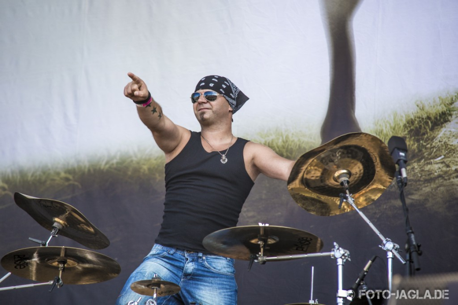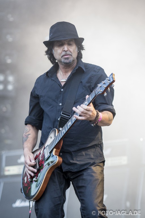 Man stelle sich vor, man wäre nicht seit 30 Jahren mit den PRETTY MAIDS aufgewachsen bzw. alt geworden und würde sich völlig unbedarft und durch den Bandnamen angezogen vor die Bühne begeben, um sich neben dem ganzen Krach auf dem Festival auch mal was fürs Auge zu gönnen... Aber lassen wir das, die Scherze über den Bandnamen der Dänen sind so alt wie die Band selber. Als sie mit dem neuen Song "Mother Of All Lies" loslegen, kommt einem allerdings sofort unweigerlich in den Sinn, dass insbesondere die beiden Bandköpfe wahrlich schon bessere Tage gesehen haben. Klar, niemand wird jünger und bei Sänger Ronnie Atkins bezieht sich das in erster Linie auf seine angestrengte Mimik beim Singen, wobei er oft aussieht als müsse er sich so manchen Ton aus dem Leib pressen, was ihm allerdings auch ziemlich gut gelingt. Aber Gitarrist Ken Hammer unter seinem weißen Cowboyhut und hinter seiner schwarzen Brille sieht ganz schön unfit aus und als wenn er sich aufgrund dessen alles andere als wohl auf der Bühne fühlt. Warum er sich immer die Fingernägel lackiert, als würde er bei Mötley Crüe oder Marilyn Manson spielen, wird sowieso auf ewig sein Geheimnis bleiben. Letztlich zählt ja aber die Musik – und die präsentiert sich heute leider auch nicht wie erhofft und gewohnt. Spieltechnisch und vom Gesang her ist alles in Ordnung und dass bei der Wärme – Ronnie entledigt sich schon während des ersten Songs seines Ledermantels - in erster Linie Standfußball gespielt wird, ist auch geschenkt. Allerdings wäre der Sound mit miserabel noch zu euphorisch beschrieb