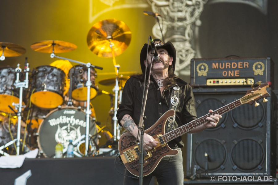 MOTÖRHEAD werden spielen! Ha, siehste wohl, der bekannteste Jack-Daniels-Trinker der Welt ist eben doch unkaputtbar. Obwohl MOTÖRHEAD ja alles andere als seltene Gäste in Wacken sind und allgemein in den letzten Jahren ziemlich viel unterwegs waren, sind dann auch (fast) alle gekommen, um sich davon zu überzeugen, ob sie denn tatsächlich spielen. Sprich: Es ist rappelvoll im Infield, als die Show um 21:00 Uhr beginnt. Aber schließlich weiß man ja nie, wie oft man Lemmy und somit eben auch MOTÖRHEAD noch live sehen kann. Aber da ist sie dann auch schon, die bekannteste Bühnenansage der Metal-Welt: "We are Motörhead and we play Rock'n'Roll". Für viele reicht das als Beleg, dass er wieder fit ist. Jawohl, er kann es noch! Und er hat vorher sogar "good afternoon" gesagt. Dass ausgerechnet "I Know How To Die" als Eröffnungstitel gespielt wird, könnte dann auch glatt als typischer Humor des Herrn Kilmister durchgehen. Aber die Nummer kommt tadellos, ebenso das nachfolgende "Damage Case". Aber sieht er nicht doch ziemlich wackelig aus? Schnauft er nicht mehr als normal? War er schon immer so bleich oder täuscht das? Ach was, das bildet man sich sicher nur ein. Schließlich ist es Lemmy, bei dem auch der Bewegungsradius nahe Null völlig normal ist. Aber spätestens ab "Metropolis" gesteht man sich ein, dass sein Gesang doch ziemlich kraftlos klingt, zudem verschluckt er auch schon mal Teile des Textes. Als er in der Songpause erzählt,