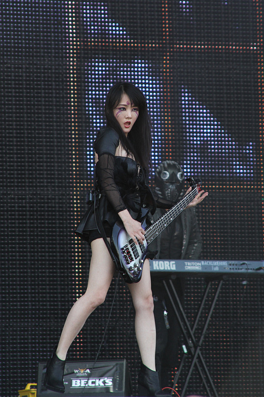 CHTHONIC heißt die Band, die einen zum musikalischen Frühschoppen zwingt. Spielten die taiwaneischen Melodic-Black-Metaller beim letzten Mal noch im Zelt, hat es die Band dieses Jahr auf die große Black Stage geschafft. Und lockt ein paar hundert Zuschauer vor die Bühne. Die Band hat ein kleines Orchester dabei, das für die asiatisch-folkloristische Untermalung sorgt und ist ansonsten ziemlich gut anzusehen. Vor allem Bassistin Doris Yeh ist eine Augenweide, aber auch der Rest der Band ist mit Gasmaske, asiatischer Gesichtsbemalung sowie grünlicher Iro-Frisur herausgeputzt.