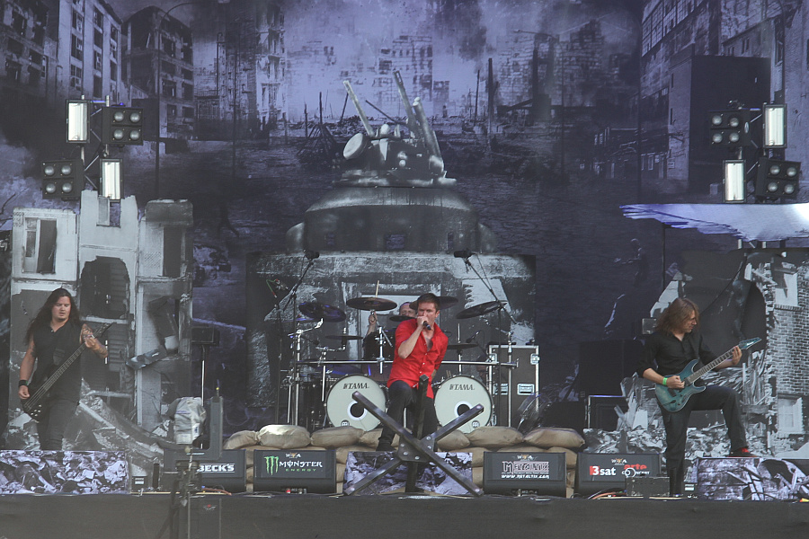 Danach ist erst einmal Wasch- und Esspause angesagt, bevor es zum langen Abendprogramm geht. Das beginnt um 16:45 Uhr mit HEAVEN SHALL BURN. Dass Deutschlands beste Death-Metal(core)-Band mit dem Publikum in Wacken leichtes Spiel haben würde, war abzusehen, trotzdem ist der neuerliche Triumphzug ein bisschen überraschend. Jedenfalls herrscht ab dem Opener "Counterweight" eine Riesenstimmung und schon beim folgenden "Land Of The Upright Ones" starten die ersten kleineren Circle Pits. "Combat" ist Programm, bei "Godiva" setzt es die erste, auch noch kleinere Wall Of Death. Bei "Voice Of The Voiceless" gelingt es Fronter Marcus Bischoff, einen Circle Pit anzusagen, ohne das Publikum explizit dazu aufzufordern. Oder so ähnlich. Jedenfalls weiß jeder, was gemeint ist, ohne dass man ihm hinterher einen Strick draus drehen könnte, wenn man denn wollte. Feuer- und CO2-Säulen schießen bei "Hunters Will Be Hunted" in den Himmel, zum Edge Of Sanity-Cover "Black Tears" begrüßt man mit Dan Swanö den Urheber dieses Klassikers auf der Bühne.