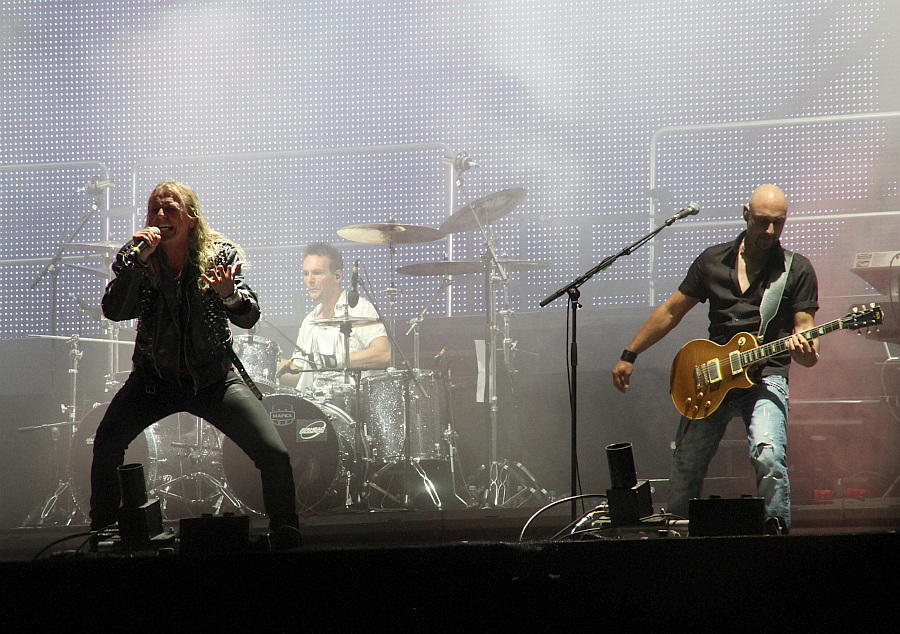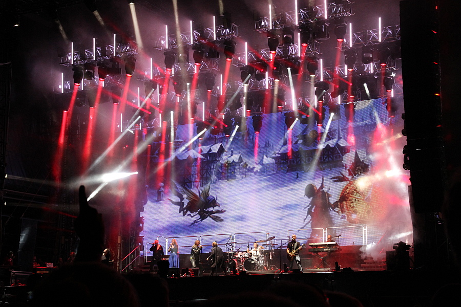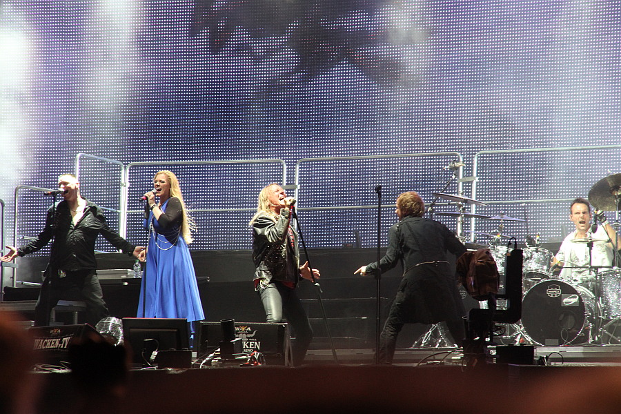 Endspurt nach dem Motto "Was interessiert mich mein Geschwätz von gestern?" Hatte AVANTASIA-Chef Tobias Sammet beim Auftritt 2011 noch verkündet, dass dies der letzte Auftritt seines Projektes sei, darf man ihn und seinen Freundeskreis drei Jahre später wieder in Wacken begrüßen. Mit einer gigantischen LED-Leinwand im Rücken und jeder Menge Pyrotechnik ist der Auftritt optisch genauso begeisternd, wie musikalisch. Den Opener "Spectres" intoniert Sammet noch alleine, zum harten "Invoke The Machine" kommt als erster Gastsänger Ronnie Atkins von den Pretty Maids auf die Bühne. Er und Sammet sind ein eingespieltes Team, was auch die Interaktion beim Gesang deutlich macht. Nach den beiden neueren Songs geht es in ein Best-of-Set, das fast keine Wünsche übrig lässt. Zum fantastischen "The Scarecrow" würde man zwar lieber Jorn Lande hören als Atkins, aber der macht seine Sache ebenfalls ordentlich. Wie üblich, kommt zum mit sichtlicher Begeisterung vorgetragenen Ohrwurm "The Story Ain't Over" Bob Catley von Magnum auf die Bühne, danach folgt der erste Höhepunkt in Form von "Reach Out For The Light", natürlich mit Sangesgott Michael Kiske. Der singt auch bei "Avantasia" mit, danach wird es mit dem balladesken "What's Left Of Me" ruhiger. Nun ist Mr. Bigs Eric Martin mit von der Partie, der im Vergleich zu den ersten Auftritten mit Avantasia