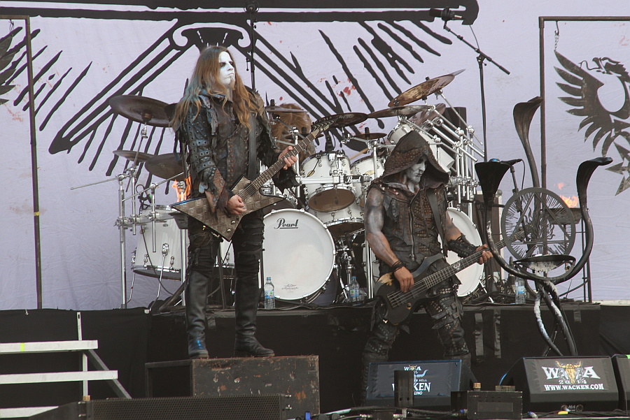 Nach dieser Vollbedienung ist erst einmal Mittagspause angesagt und es geht zurück zum Campingplatz. Weil dann der Shuttlebus zum Gelände zeitlich nicht so fährt, wie man es gerne hätte, sind EMPEROR schon mitten in ihrem Set, als man wieder an den Bühnen angekommen ist. Anlässlich des 20-jährigen Jubiläums ihres für den Black Metal der zweiten Welle wegweisenden Debüts wird "In The Nightside Eclipse" in voller Länge dargeboten. Das Interesse daran ist jedoch vergleichsweise niedrig, denn man kann problemlos in die vorderen Reihen laufen. Für ein Festival wie das Wacken Open Air ist ein solcher Auftritt dann zu speziell, um die Massen anzulocken. So finden sich dann auch eher die wahren Genießer vor der Bühne wieder und erleben einen zumindest musikalisch legendären Auftritt. Ob man EMPEROR in dieser Form und mit dieser Setlist in der Zukunft nochmal erleben wird, ist jedenfalls fraglich. Wenig schwarzmetallisch ist das Auftreten von Frontmann Ihsahn mit zurückgegelten Haaren und Hornbrille - aber das war auch nicht anders zu erwarten. Während seine Darbietung auch eher statisch ist, sorgen Gitarrist Samoth und Bassist Secthdamon für deutlich mehr Bewegung und selbst Keyboarder Einar Solberg schüttelt die Haare.