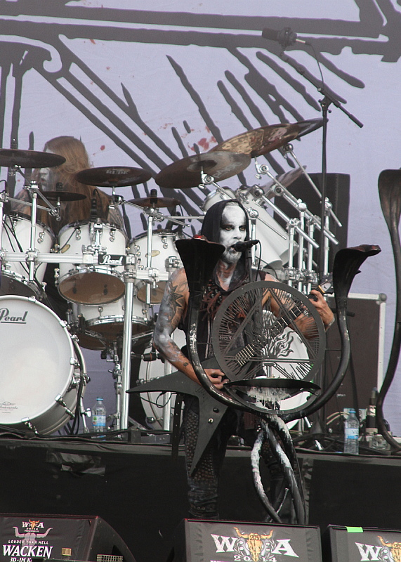 Was danach folgt ist nichts anderes als die pure Machtdemonstration. BEHEMOTH haben mit "The Satanist" nicht nur das Album des Jahres abgeliefert, sondern sind auch live in bestechender Form. Klar, eigentlich waren sie schon immer eine gute Liveband, aber angesichts der Tatsache, dass Fronter Nergal sich vor nicht allzu langer Zeit einer langwierigen Leukämie-Behandlung unterziehen musste, ist es noch beeindruckender, wie die Band sich präsentiert. Ultratight, mit extrem sehenswerter Bühnenshow inklusive aufwändiger Deko und mit einem Charisma von fast allen Musikern, von dem andere Bands nur träumen können. Erwartungsgemäß startet der Triumphzug bei ziemlich gutem Sound mit "Blow Your Trumpets Gabriel", gefolgt vom grandiosen "Ora Pro Nobis Lucifer".