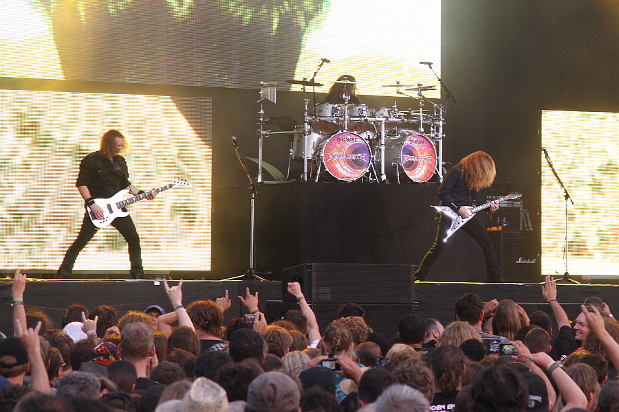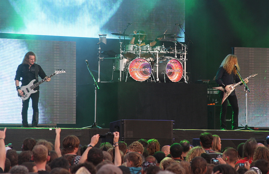 Man musste im Vorfeld ja befürchten, dass es wieder nichts wird mit dem ersten Auftritt von MEGADETH in Wacken, schließlich hatten diese zuvor einige Festivals und Konzerte aufgrund eines Todesfalles in der Familie von David Ellefson abgesagt. Aber nun soll es tatsächlich losgehen – verspricht zumindest kurz das Intro von "Prince Of Darkness", bevor ihm der Saft ausgeht und wieder Stille einkehrt. Oh ha, das fängt ja gut an. Wenn man die dünne Haut von Dave Mustaine kennt, lässt das nichts Gutes erahnen. Aber kurz danach kann es dann doch mit "Hangar 18" richtig losgehen, auch wenn Dave Mustaine dabei noch etwas griesgrämig aus der Wäsche guckt. Dessen Stimme wächst ja bekanntlich auch mit zunehmenden Promillewert des Zuhörers und mir (und wohl auch manch anderem) gefällt sie heute ausgesprochen gut. Das kann man vom Sound nicht gerade behaupten. Einmal mehr zu leise und teilweise auch ganz schön schwammig, nimmt dieser auch den nächsten Songs "Wake Up Dead" und "In My Darkest Hour" die Durchschlagskraft. Dafür gibt es aber einiges fürs Auge, denn showtechnisch versuchen MEGADETH sich Headliner-würdig zu präsentieren. Licht bis zum Gehtnichtmehr, die drei Leinwände auf der Bühne, oftmals mit alten Videos gefüttert, im Dauereinsatz. Nach einer Weile kann man dann auch das Riff- und Sologewitter richtig genießen. Dave Mustaine agiert dabei unaufgeregt bis gelangweilt und im Kontakt zum Publikum äußerst wortkarg,