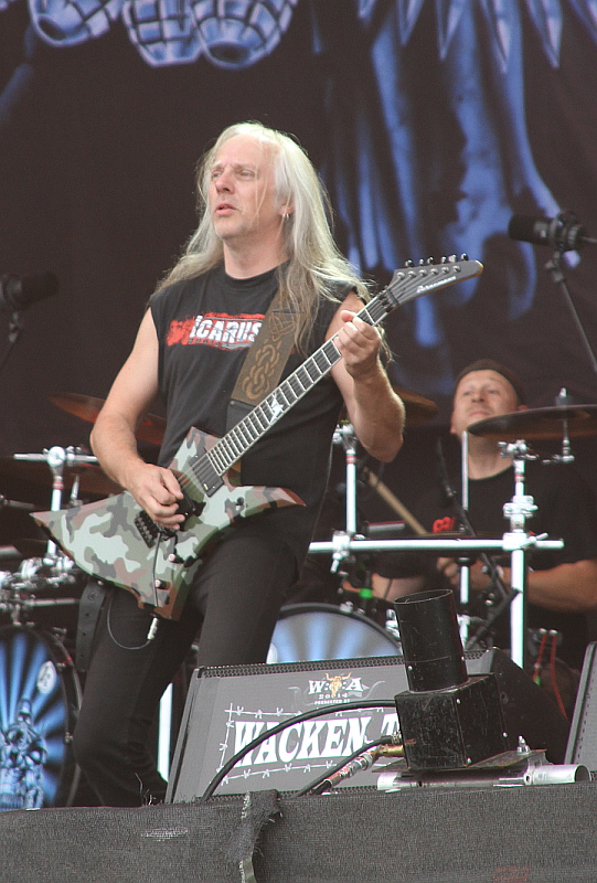 aber immerhin nicht zu offensichtlich angepisst und spielerisch im Volleinsatz. Gleiches gilt für seinen Mit- und Gegenspieler Chris Broderick, der zudem den Strahlemann gibt, über die Bühne wieselt und gestenreich Fankontakt aufnimmt. Der Mann ist die reine Spielfreude. Das Volk - es ist übrigens keineswegs brechend voll vor der Bühne - saugt währenddessen jeden Song dankbar auf, es hat ja auch lange genug gedauert, bis man Klassiker wie "Sweating Bullets", "Symphony Of Destruction" und "Holy Wars... The Punishment Due" in Wacken zu hören bekommt. Auf "A Tout Le Monde" wartet man heute zwar vergeblich und von aktuellem Stoff kommen nur "Kingmaker" und das Thin-Lizzy-Cover "Cold Sweat" zum Einsatz, aber die Fans stört das natürlich nicht, die feiern ihre alten Lieblingssongs. Zu "Peace Sells" dürfen sie dann noch kurz Vic Rattlehead begrüßen. Mit dem instrumentalen "Silent Scorn" und "My Way" klingt dann eine gute, wenn auch nicht spektakuläre Show aus, die sicher nicht alle (zum Teil doch arg hohe) Erwartungen erfüllen konnte, weil irgendwie doch das Besondere gefehlt hat. Oder einfach nur ein besserer Sound. (LS)