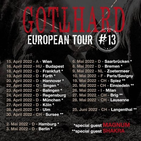 „Nach zwei Jahren Pandemie wird die Gotthard Tournee im April definitiv stattfinden und wir freuen uns sehr darüber. Das lange Warten für uns und für euch hat endlich ein Ende und wir freuen uns auf Euch. Lasst uns zusammen wieder Vollgas geben und endlich Musik Live genießen.“