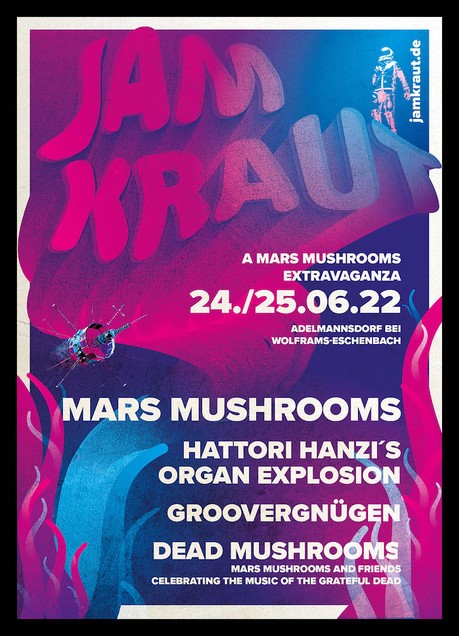 Adelmannsdorf: Am 24. und 25. Juni 2022 veranstalten die mars mushrooms im mittelfränkischen Adelmannsdorf bei Wolframs-Eschenbach erstmalig ihr neues, eigenes Festival „Jamkraut“. Dazu hat sich die Band ein spannendes Lineup mit klarem Fokus auf spontaner Improvisation ausgedacht. „Seit einiger Zeit spielen wir schon mit dem Gedanken, endlich mal wieder ein Marsis Festival zu veranstalten, bei dem wir uns selbst feiern und Bands dazu einladen, die wir so richtig gut finden. Mit Jamkraut arbeiten wir derzeit an einem Event, das alles, was uns irgendwie heilig ist, auf wundervolle Art und Weise vereint.“ So beschreibt die Band selbst in ihrem letzten bandeigenen Newsletter den Gedanken hinter Jamkraut.