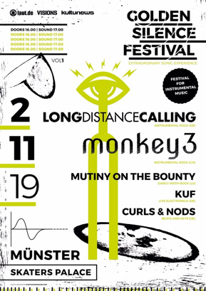 Neu ins schweigsame, jedoch kein bisschen leise Line-Up sind unlängst die Schweizer Psychedelic-Rocker MONKEY 3 gerutscht, die mit ihrem sechsten Album irdische "Sph(a)ere(n)" zurücklassen - und die Schweden EF ersetzen. Die Lokalmatadore LONG DISTANCE CALLING werden die erste Auflage headlinen, "um dem Festival einen guten Start zu ermöglichen", so die Veranstalter. Außerdem am Start sind MUTINY ON THE BOUNTY (LUX), KUF (D) und CURLS & NODS (D).