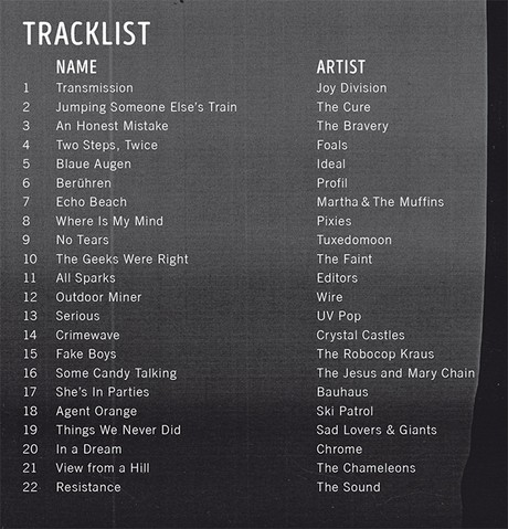 01. Joy Division - Transmission 02. The Cure - Jumping Someone Else's Train 03. The Bravery - An Honest Mistake 04. Foals - Two Steps, Twice 05. IDEAL - Blaue Augen 06. Profil - Berühren 07. Martha & The Muffins - Echo Beach 08. Pixies - Where Is My Mind? 09. Tuxedomoon - No Tears 10. The Faint - The Geeks Were Right 11. Editors - All Sparks 12. Wire - Outdoor Miner 13. UV Pop - Serious 14. Crystal Castles - Crimewave 15. The Robocop Kraus - Fake Boys 16. The Jesus & Mary Chain - Some Candy Talking 17. Bauhaus - She's In The Parties 18. Ski Patrol - Agent Orange 19. Sad Lovers & Giants - Things We Never Did 20. Chrome - In A Dream 21. The Chameleons - View From A Hill 22. The Sound - Resistance